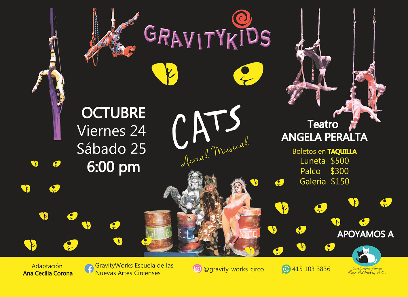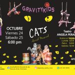 El 24 y 25 de octubre, a las 6 de la tarde, los gatos tomarán el escenario. Nos vestimos, nos maquillamos, nos transformamos; se encienden las luces, comienza la magia: saltamos, bailamos y volamos entre telas, aros, trapecios y música. Creamos un mundo donde la gravedad es solo un recuerdo.